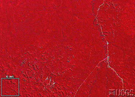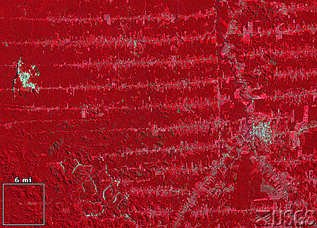 Below are some aerial images of growth in the Brazilian state of Rondonia, which is in the Amazon Rainforest. Notice how over the years the Amazon's supply of trees are depleting. The deforested land and urban areas appear in light blue; healthy vegetation appears red. The first image is from 1975, the second from 1986 and the third from 1992. | |||||||||||||||||
